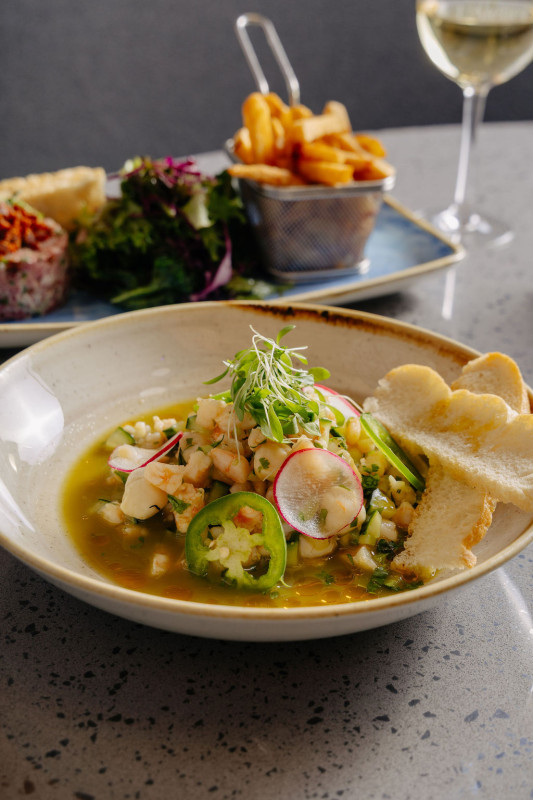 Ceviche de crevettes et pétoncles, aguachile, concombre, céleri, jalapeño, radis, huile de cayenne