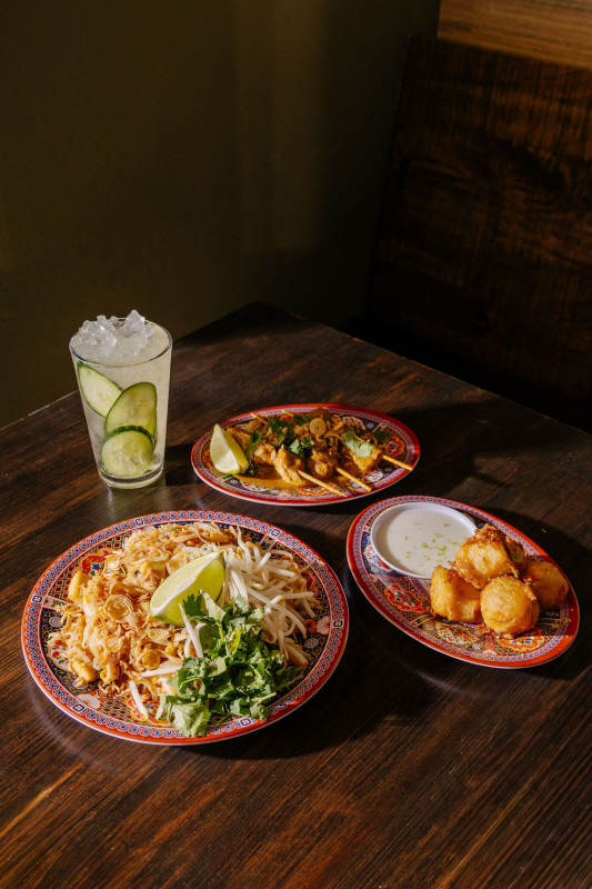 Moo Ping, brochettes de surlonge de porc mariné dans un mélange sucré-salé, servies avec une sauce onctueuse au curry jaune et lait de coco. Accompagné d'un cocktail au choix entre le Jardin de Jade ou le Hôi An (avec ou sans alcool)