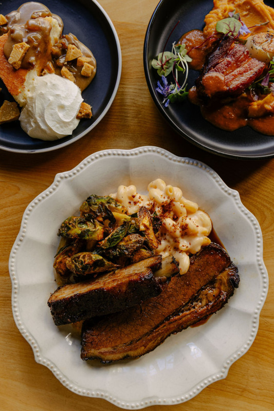 Duo brisket de boeuf et côtes levées Saint-Louis fumées, choux de Bruxelles façon buffalo, mac and cheese & pain de maïs maison