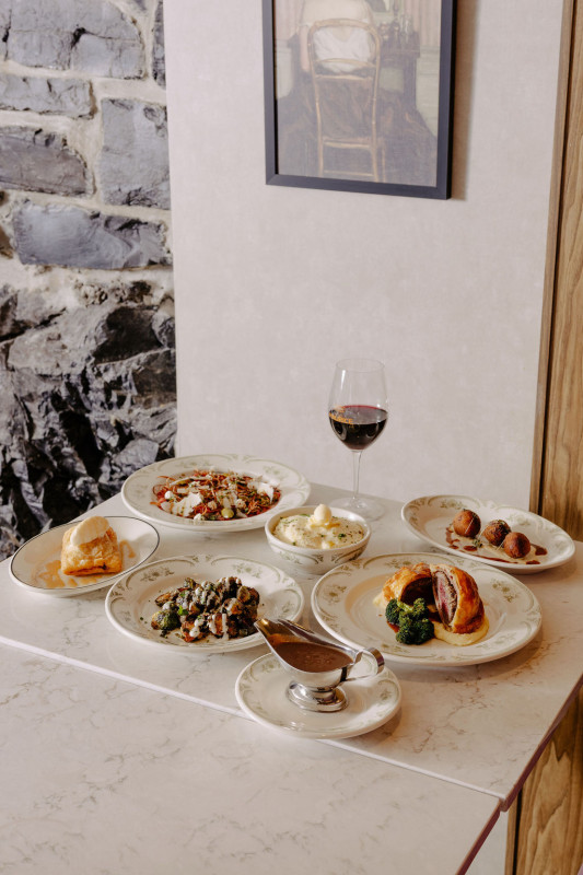 Bœuf Wellington au Pata Negra accompagné de choux de Bruxelles à la sauce Voodoo, yogourt au fromage bleu et purée de panais