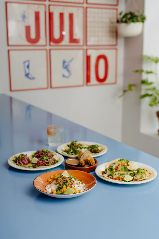 Tacos carnitas au porc confit, oignon mariné, coriandre & salsa verde