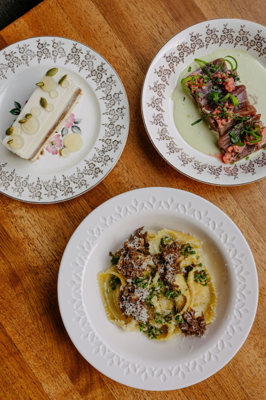 Agnolotti à la courge, agneau effiloché, beurre au kombucha et chimichurri
