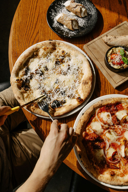 Pizza champignons, shitakes, châtaignes, bolets jaunes, champignons de Paris, mascarpone, oignons caramélisés, sel de truffe, Fior di latte, fontina & ricotta salata