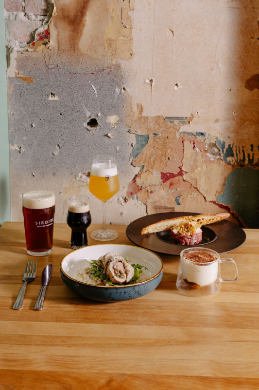 Tartare de bœuf saisi et coupé finement, assaisonné d’un chimichurri relevé, garni de noix de Grenoble épicées et de fromage fin. Accompagné d'un 7 oz de bière NEIPA
