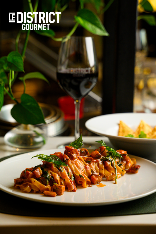 Tagliatelle, pancetta rôtie, poivre, basilic, épinard, sauce rosée