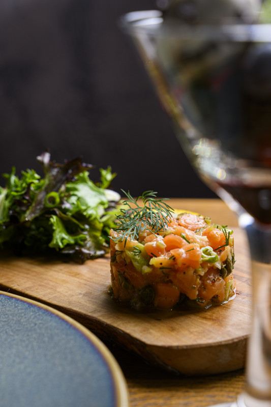 Tartare de saumon, garnitures classique, croûtons et verdurette